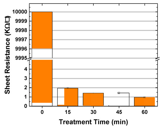 Moreover, the alterations in the bandgap of black TiO2 thin films led to changes in their electrical properties. Figure 9 demonstrates a significant sheet resistance reduction of 99.98% after 15 min of hydrogenation, and for longer durations, the sheet resistance of the samples continues to decrease, albeit at a slightly lower rate of −20 (Ω/□) min−1. This enhancement in conductivity can be attributed to the increased concentration of Ti suboxides (Ti3+/2+) in the black TiO2 thin films, as they result in an excess of electrons in the electronic states adjacent to the Fermi edge [37,48].