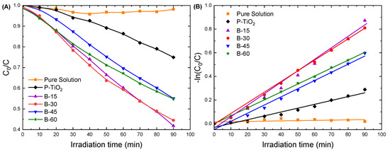 Figure 10a reveals that the B-15 and B-30 samples demonstrated higher photodegradation rates, with around 60% of the MB dye decomposed, while the B-45 and B-60 samples exhibited photodegradation performance at around 45%. However, all black TiO2 samples displayed superior photocatalytic performance compared to the pristine TiO2 film, which decomposed only about 25% of MB after 90 min of reaction. The improved photocatalytic performance of the black TiO2 films can be attributed to the presence of Ti3+/2+ interstitials, oxygen vacancies (Vo), and hydroxyl radicals (OH) on the film surface. These findings align with the results obtained from XPS analysis.