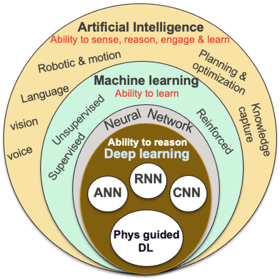 A scheme of artificial intelligence, machine learning, deep learning, and physics-guided deep learning, where ANN, CNN, RNN, and DL, respectively, represent artificial neural networks, convolutional neural networks, recurrent neural networks, and deep learning.