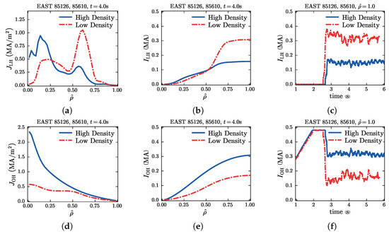 The current components for high-density (85126) and low-density (85610) EAST discharges are calculated. (a) LH current density (), (b) LH current within a plasma radius as a function of radius at time s, (c) LH current as function of time (d) ohmic current density, (e) ohmic current within a plasma radius as function of radius at time s, and (f) ohmic current as function of time are shown.