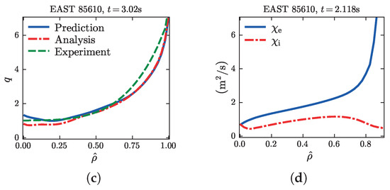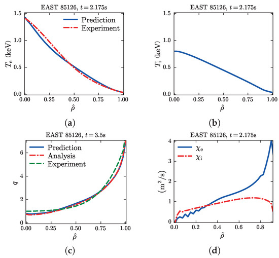 Among the discharges simulated are experimental data from 6 EAST discharges with ohmic and L-mode plasmas: plasmas with low, intermediate, and high density; plasmas with independent and simultaneous LH heating; and plasmas with a combination of NBI and LH heating [38,39,40]. Table 1 lists the primary parameters of the EAST discharges. High-density discharge (85126), low-density discharge (85610), and intermediate-density discharge (80208) simulated profiles are provided. The TRANSP code or the EFIT code [35] are used to process the data. The table includes some of the significant experimental parameters for the six EAST discharges: the major radius R (m); minor radius a (m); elongation ; triangularity ; vacuum toroidal magnetic field (T); toroidal plasma current (MA); line-averaged electron density in units of m−3; average ; lower hybrid power (MW), and neutral beam injection (NBI) power (MW). The final item in the table is the diagnostic time (s), at which the simulated profiles are compared to the experimentally measured TRANSP or EFIT processed profiles. MMM is used to predict the time-evolved electron temperature, ion temperature, flow shear, and current density profiles. The toroidal equilibrium code TEQ [34] is used to compute the self-consistent evolution of the equilibrium. The Chang–Hinton model [28] is used to compute neoclassical transport. The LH and NBI heating and current drive are obtained using the GENRAY/CQL3D [41] and NUBEAM modules [30], respectively.
