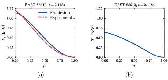 In Figure 3, the predicted and experimental profiles for low-density discharge 85610 are displayed. Good agreement is also discovered for low-density discharge, much as for the results for high-density discharge. The RMS deviation of the predicted electron temperature profile from the experimental profile is 8.8%, whilst the predicted profile’s RMS deviation from the experimental profile is 11.3% and the offset is −3.5%. The electron temperature is a little lower in the low-density discharge because it has a higher electron thermal diffusivity than the high-density discharge 85126. Ion energy transfer in ohmically heated tokamaks is typically only a fraction of neoclassical transport, whereas electron thermal transport predominates. ETG modes, also known as electron temperature gradient-driven lower hybrid drift modes [51], are responsible for the majority of electron thermal transport.