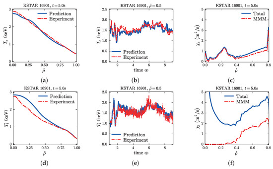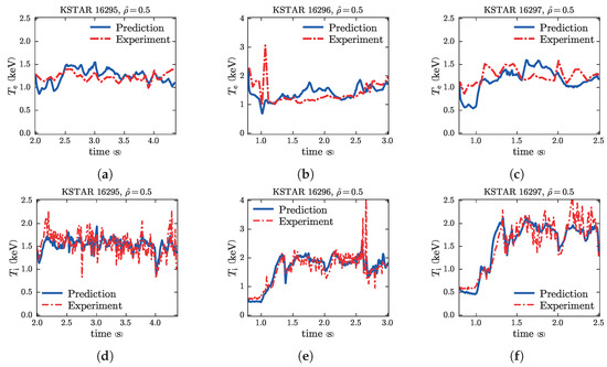 Electron temperature and ion temperature for high- KSTAR discharge (a,d) 16295, (b,e) 16296, and (c,f) 16297, based on predictions and measurements as a function of time for .