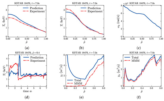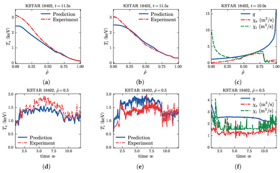Predicted and measured electron temperature, ion temperature, as well as , , and versus (a–c) at time s and (d–f) versus time for for high KSTAR discharge 18402.