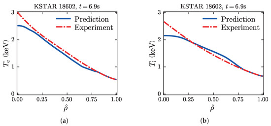 The predicted temperature profiles are compared with the corresponding experimental profiles as a function of space and time for high- KSTAR discharge 18602 in Figure 9. By adjusting the aiming of ECCD injection location, toroidal Alfvén eignmodes are mitigated, leading to increased stored energy and high . When these profiles are analyzed as a function of space and time, there is a remarkable degree of consistency between the predicted and experimental profiles (see Table 4).