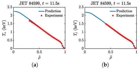Predicted and measured electron (a) and ion (b) temperatures as a function of for JET discharge 84599 at time s. It should be noted that there is an absence of experimental data to compare with the predicted profiles of electron temperatures from = 0–0.3 and ion temperatures from = 0–0.4.