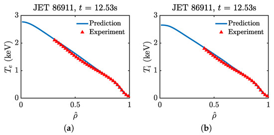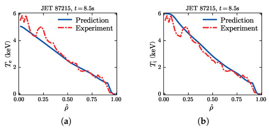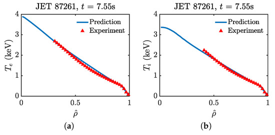 Predicted and measured electron (a) temperature as a function of for JET discharge 87215 at time s. The ion temperature (b) is considered to be the same as the electron-measured temperature for this discharge.