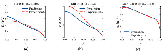 Predicted and measured electron temperature (a), ion temperature (b) and electron density (c) as a function of at time s for DIII-D time-dependent rotation ramp-down discharge 144449.
