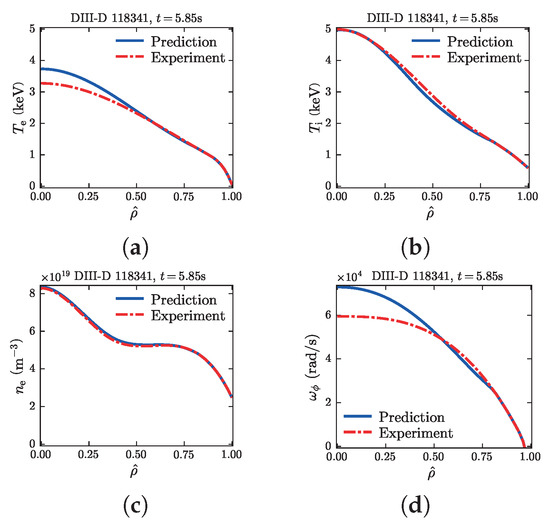 MMM is used to conduct predicted simulations for four DIII-D discharges. In contrast to the previous simulations, where electron and ion temperature, profile and, in some cases, toroidal rotation profiles are evolved, in these DIII-D simulations, additional profiles including the density and/or toroidal rotation frequency, and shear are also evolved. The four DIII-D discharges consist of 144449 time-dependent rotation ramp-down discharge [69], 118341 stationary hybrid discharge [21], and 153283 [70] and 150840 [71] stationary discharges. Table 7 displays the critical parameters for these DIII-D discharges. Electron and ion temperatures, electron density, and toroidal rotation velocity profiles are simulated and plotted in Figure 14, Figure 15, Figure 16 and Figure 17, enabling comparison with experimental profiles. The predicted simulations’ boundary conditions for all four of these shots are set at . Rotation is not predicted for discharge 144449 because of the difficulties introduced by ramping down the torque in the shot. Note that the temperatures and density profiles continue to change in the 144449 discharge as shear decreases due to rotation ramp-down, and the electron and ion temperature profiles are not predicted as well as the other DIII-D discharges. This discharge was intended to investigate the behavior and dynamics of plasma rotation during a controlled decrease or “ramp-down” over a specific period of time. This reduction in plasma rotation was accomplished by modifying the NBI orientation. This effort can aid in the understanding and optimization of ITER scenarios with low toroidal rotation. Hybrid discharge 118341 ramps density slightly up throughout the discharge time, and the density prediction is very good for this shot as shown in Figure 15. Density ramps are used to optimize the plasma scenario and achieve the desired plasma states. By systematically ramping the density, it is possible to find the optimal operating conditions for specific scenarios, improving plasma performance and achieving the desired plasma parameters. ITER may be able to access a broader variety of high-performance scenarios than was previously anticipated, according to projections of the hybrid mode of operation [21].