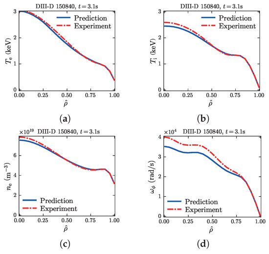 Electron temperature (a), ion temperature (b), electron density (c), and toroidal rotation (d) as a function of at time s for DIII-D discharge 150840, including both predicted and measured values.