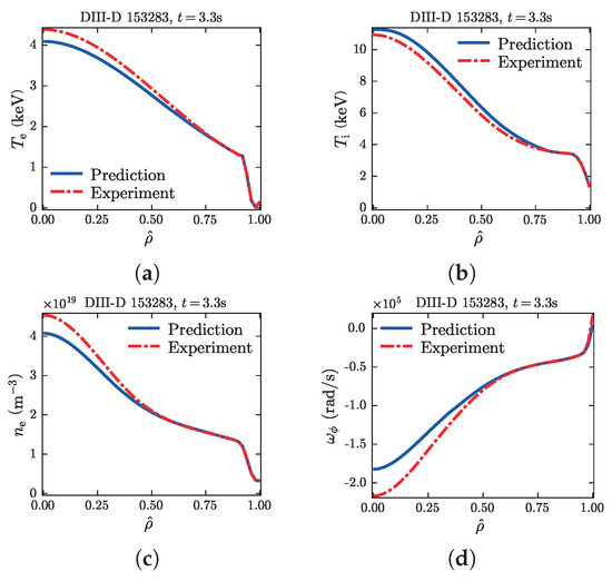 Electron temperature (a), ion temperature (b), electron density (c), and toroidal rotation (d) as a function of at time s for DIII-D discharge 153283, including both predicted and measured values.
