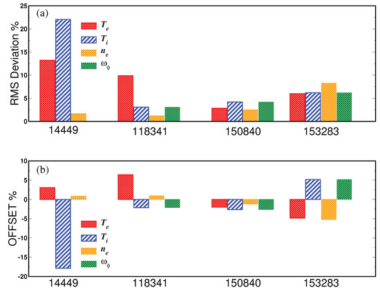 The RMS deviations and offsets vary from discharge to discharge. The RMS deviations, RMS deviations range, offsets, and offset range are shown for 5 ITB discharges, 4 high discharges, 6 high discharges, a high , and a moderate discharge as shown in Table 4. It is discovered that the RMS deviation falls within the margin of error associated with the experimental measurement. The average RMS deviations for electron and ion temperature profiles for 17 KSTAR discharges are 7.4% for electron temperature and 13.0% for ion temperature, and the average offsets of −1.8% for electron temperature and 9.4% for ion temperature.