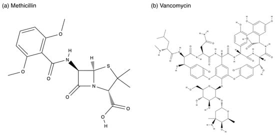 Chemical structure of (a) methicillin and (b) vancomycin.