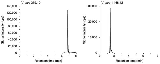 Methicillin and vancomycin were detected by Q/TOF-MS after separation by LC. The signals at m/z 379.10 and 1446.42 were monitored. Strong peaks detected at the retention times of 6.8 min and 1.4 min were assigned to methicillin and vancomycin, respectively (Figure 2).