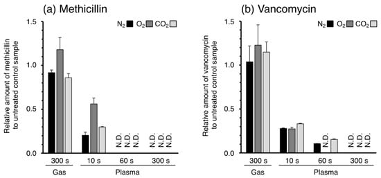 Relative amounts of (a) methicillin and (b) vancomycin in the solution after plasma or gas treatment. The values represent the relative amount of antibiotics in plasma (10 s, 60 s, and 300 s) and gas-treated solution to that in untreated control sample. The results of N2, O2, and CO2 plasma were depicted as black, gray, and pale gray bars, respectively. Data represent mean value of repeated measurements (S.D., n = 3), and the data for which the signals on the corresponding m/z were not detected are expressed as N.D.