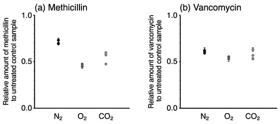 Repeatability of plasma treatment for 10 s. Three independent solutions of (a) methicillin and (b) vancomycin were treated with plasma jet generated from N2, O2, and CO2. The amounts of antibiotics in each sample were measured three times, and analytical uncertainties were expressed as error bars on each symbol.