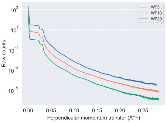 X-ray reflectivity curves of the deposited films. The curves have been slightly displaced vertically for better visibility.