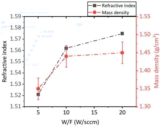 The calculated density and the refractive index of the PP-HMDSO thin films are presented in Figure 2. The film deposited at 5 W/sccm reveals a low density (1.35 g/cm3) compared to the films deposited at 10 W/sccm and 20 W/sccm (values close to 1.45 g/cm3). In addition, the refractive index of the SiOCH films increases from 1.52 for the films deposited at 5 W/sccm to values close to 1.57 for the films deposited at 10 W/sccm and 20 W/sccm. In fact, the variation of the films’ density generates a variation of the deposited films’ refractive index while increasing the W/F parameter. Indeed, the well-known Clausius–Mossotti Equation (5) reveals the influence of the material density on the dielectric constant or the refractive index (n), since n = ε2 in the visible optical range: