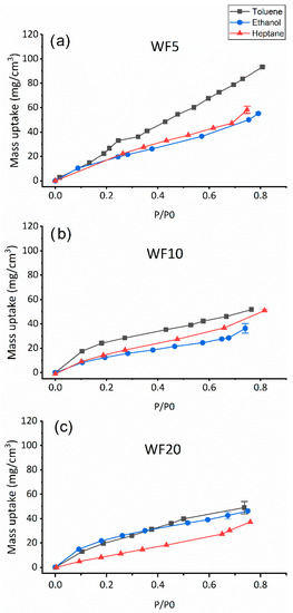 QCM sorption isotherms (25 °C) showing the evolution of ethanol, heptane and toluene vapor mass uptake with P/P0 (P0 being the saturated vapor pressure) for (a) WF5, (b) WF10 and (c) WF20.