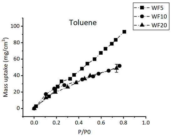 In fact, the toluene isotherm loses its linearity while increasing W/F from 5 W/sccm to 10 W/sccm and the final uptake mass value decreases from 100 mg/cm3 to approximately 50 mg/cm3. These variations indicate a slower sorption process, especially at lower P/P0 values, typically between 0 and ~0.2, and a weaker affinity for WF10 and WF20 deposits towards toluene compared to WF5.