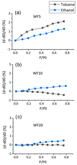 Swelling of the elaborated PP-HMDSO thin films while exposed to toluene or ethanol atmospheres, P0 being the saturated vapor pressure. d0 is the initial film thickness under vacuum and d is its thickness under P/P0 of toluene of ethanol. (a) WF5, (b) WF10 and (c) WF20.