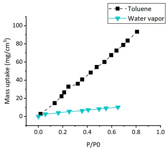 Since the WF5 deposit revealed the better affinity towards toluene, it might be interesting to study the affinity of the WF5 deposit towards humidity. Figure 6 shows a comparison between the WF5 deposit responses towards toluene and water vapor. The water vapor isotherm reveals extremely low mass uptakes compared to the toluene, indicating a very weak sensitivity of WF5 towards water vapor.