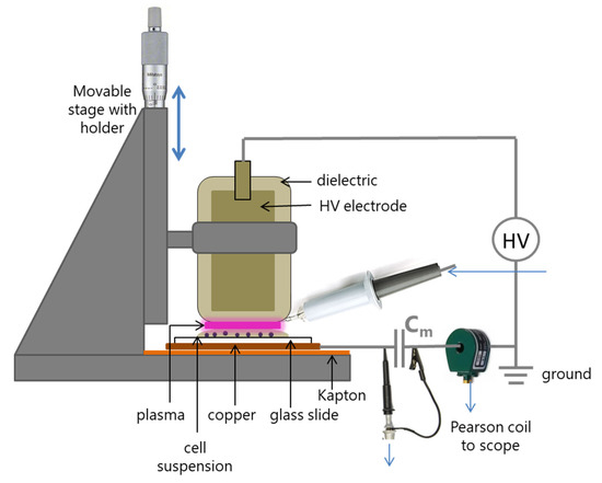 The FE-DBD used for cell treatments generated a main pulse of 8 μs and a total pulse duration of ~15 μs at a controlled repetition rate (250 Hz) and output amplitude dependent on distance of the electrode from the substrate (Figure 2). A Tektronix D (2 GS/s, 250 MHz) oscilloscope was used to monitor the current, voltage, and charge transfer in the circuit during experiments: current to ground (Pearson Model 2877 Current Monitor, 1 V/A, 2 ns rise time); voltage at the high voltage electrode (Tektronix P6015 HV probe); and charge transferred was determined by measuring the voltage across a 10 nF capacitor connected in series on the ground side (Figure 2). The HV probe was connected at the bottom of the electrode in direct contact with the side edge of the dielectric (Figure 2). Measurements of voltage, current, and charge transferred were monitored continuously and recorded within 1 s of turning on the power and again at the end of the 20 s treatment. Lissajous figures, the plots of charge versus voltage in the circuit, were used to estimate the energy consumption per cycle and for monitoring the changes in the substrate capacitance, which included the glass coverslip and the cell suspension. Independence measurements of the dielectric properties of cell suspensions were conducted using a vector network analyzer.