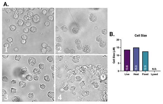 (A) High-contrast brightfield imaging was used to visualize live (A1), heat-killed (A2), PFA-fixed (A3), and lysed Vero cells (A4). Average cell size (B) was calculated using image analysis software (Gen5 software). Statistical analysis was performed using an ordinary one-way ANOVA, comparing the sample means to the mean of live cells. N.D. = No data.