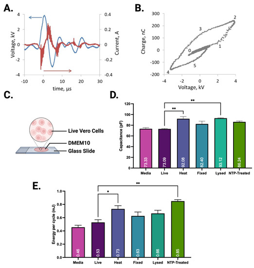 At a setting of 8.5 kV, 250 Hz pulse repetition rate, the applied pulse (A) has an average voltage of 6–9 kV p-p during the first full oscillation about 8 μs long. A plot of the charge on the measurement capacitor as a function of the applied voltage forms a Lissajous figure (B) used to compute the power per pulse supplied to the discharge as well as the overall equivalent circuit capacitance during the discharge. The different cell preparations were exposed to NTP and substrate capacitances were measured. Statistical analysis was performed using an ordinary one-way ANOVA, comparing the sample means to the mean of live cells (C,D). Energy per cycle delivered by the power source during the discharge for different biological targets (E). * p < 0.05; ** p < 0.005.