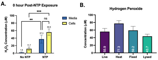 Media, in the presence and absence of live Vero cells was exposed to NTP at 250 Hz frequency. Immediately after NTP exposure, the hydrogen peroxide concentration in media of live Vero cells was compared to media alone (A) and dead Vero cells (B). ** p = 0.0066, *** p = 0.0009, ns = not significant.