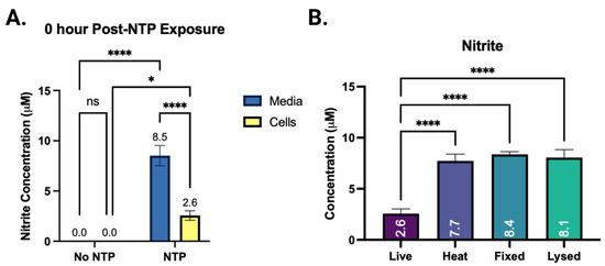 Nitrite concentrations were quantified using the Invitrogen Griess Reagent Kit (Invitrogen, Waltham, MA, USA, Cat. G7921) in accordance with the manufacturer’s instructions. Samples were prepared and exposed to NTP as described for the hydrogen peroxide assay. Absorbance was measured at 540 nm using the Agilent Cytation 5 and nitrite concentrations (μM) were calculated using a standard curve line equation.