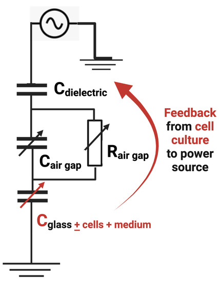 Biological cells are dynamic targets that are electrically active and influence the properties of NTP. The exposure of cells to NTP induces oxidative stress responses as a mechanism to maintain redox homeostasis and adapt to their environment. The concept of adaptive plasmas has been proposed by Keidar et al. that transition from a spatially homogeneous state to self-organizing modifiable patterns when they interact with different targets [21,22,23]. Their measurements indicate that cell capacitance influences the properties of the NTP applied by the plasma jet and demonstrate the impendence-based feedback effect [24]. These reports strongly suggest that the interactions at the interface of two dynamic systems—NTP and cells—are likely to induce feedback and feedforward loops which, in turn, will change the NTP properties and the cell response. In addition to the substrate alone, the entire system, including the support, the table, and in case of in vivo targets, the animal or a human, can affect the electrical circuit parameters and the resulting NTP [25].