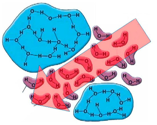 Due to their highly polar nature, water molecules have the tendency to create hydrogen bonds between one another even before their freezing point [27]. As a result, liquid water can exist in two possible structures: the amorphous state, where water molecules move freely and are not bonded to one another, and the nano-crystalline or structured state, where molecules begin to form bonds between one another, causing significant differences in density, surface tension, viscosity, and other physical properties. This tendency to begin forming structures significantly above the freezing temperature is the essence of water’s unique and anomalous behavior compared to other liquids. The lower the temperature the water is brought to, the higher the proportion of nano-crystalline structures. Figure 1 shows a depiction of nano-crystalline and amorphous structures in water, as reported by Semak et al. [28]
