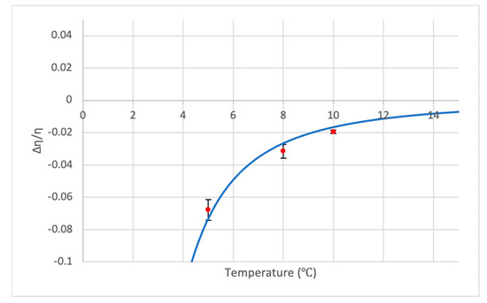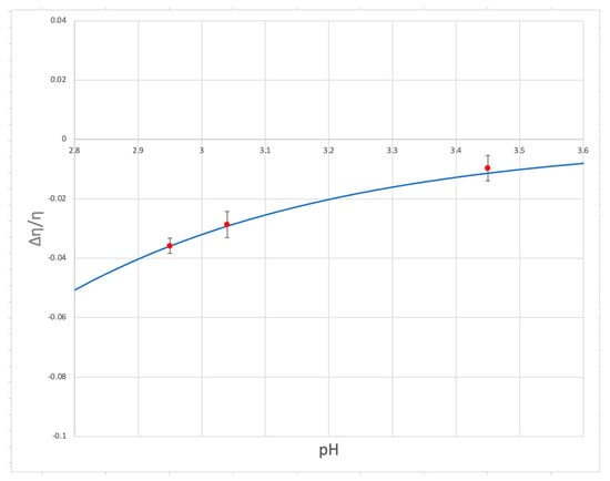 Now, by using the data in Table 3, we can determine if is proportional to . Using the dynamic viscosity values at 10 °C, for each PAW sample, we calculate , where is the dynamic viscosity of the given PAW sample, and is the dynamic viscosity of distilled water. Plotting these values against the pH of each sample gives Figure 4.