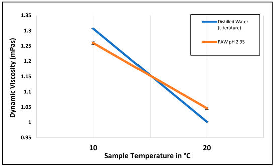 The dynamic viscosities of distilled water [35] and PAW at pH 2.95 at 10 °C and 20 °C.