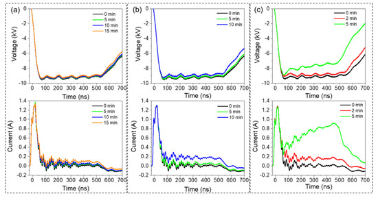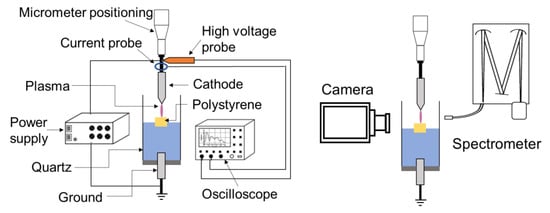 Negative high-voltage pulses are applied to the cathode using a pulser (NSP 120-20-N-500-TG-H; Eagle Harbor Technologies, Seattle, WA, USA). The high-voltage amplitude and pulse width are −12 kV and 500 ns, respectively, whereas the repetition rate is adjusted to 2, 5, or 10 kHz. The voltage and current waveforms are measured using a high-voltage probe (P6015A, ×1000; Tektronix, Beaverton, OR, USA) and a current monitor (6585, 0.5 V/A; Pearson, Palo Alto, CA, USA), respectively, and they are recorded on an oscilloscope (MSO54, 2 GHz, 6.25 GS/s; Tektronix) every minute of processing.