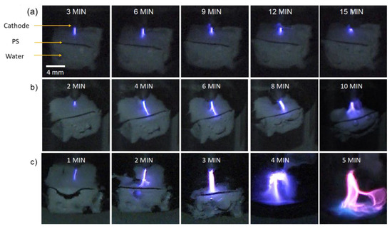 At this stage, it is important to compare the results with those obtained without PS. Indeed, in a recent study [30], we investigated the evolution of the plasma properties of a discharge in contact with water without PS and reported a rise in gas temperature, as well as an increase in water conductivity and acidity during plasma processing. The water volume was higher than the one here (50 vs. 10 mL) and, therefore, a complete transition to a spark was not reached; there was only a partial transition. Furthermore, with the processing time, the authors observed an increase in the discharge current, an increase in the N2 emission signals in streamer mode before the transition to spark mode (the data were not reported for the spark regime), and an increase in the rotational temperature of the N2 molecule. This similarity suggests that the PS plays a non-significant role in the discharge kinetics that is rather sensitive to the water’s characteristics. In another study that addressed the interaction of a similar discharge with a suspension of crystalline nanocellulose (CNC) [31], a similar behavior was also observed, despite the fact that after processing, the CNC was gelled. This is an interesting finding as it suggests that the streamer-to-spark transition can be controlled by adjusting the solution properties, and this feature can be further explored in a future process to maintain the ‘constant’ action of plasma exhibiting different properties (streamer or spark) on the PS sample [31,32,33].