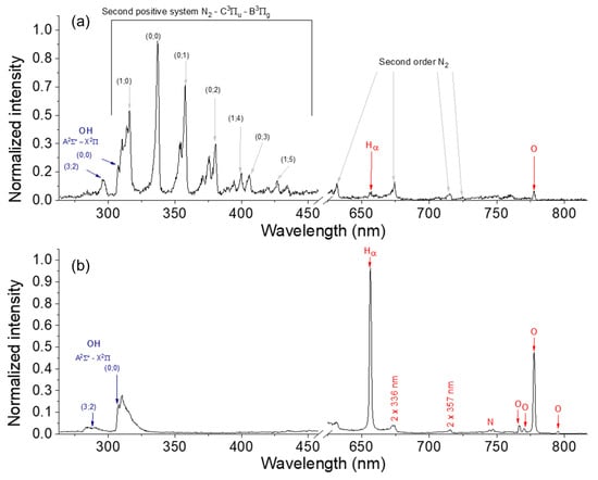 Optical emission spectra of the negative polarity (V = −12 kV), high-frequency (10 kHz) discharge recorded after (a) 3 min (streamer mode) and (b) 5 min (spark mode) of processing.