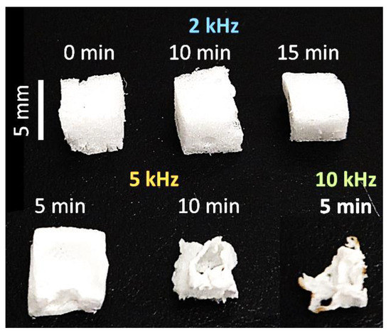 The degradation of PS was assessed visually, as well as by measuring the weights and recording the FTIR spectra of the PS samples before and after processing. Our visual assessment of the images recorded using a standard camera shows that the sample exposed to a 2 kHz discharge exhibits no significant change in structure, even after 15 min (Figure 5). Meanwhile, a part of the sample processed at 5 kHz disappears after 5 min of processing, and its shape changes completely to a crumbled film after 10 min. A similar film-like structure is also observed for the PS sample processed at 10 kHz, after only 5 min. A complete degradation of the PS is not detected, as the samples move away from the discharge area after their shape changes.