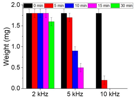 The weights of the PS samples were measured before and after processing using a precision balance. Prior to weighing, the processed samples were dried to ensure the complete removal of the water. As shown in Figure 6, the weight of the sample processed at 2 kHz does not significantly change after 15 min of processing, and weight loss is observed only after 30 min. In contrast, the weight of the 5 kHz sample decreases from 1.8 ± 0.1 mg before processing to ~1.7 ± 0.1 and ~0.9 ± 0.1 mg after 5 and 10 min of discharge exposure, respectively. At 10 kHz, the decrease in the PS sample weight becomes more significant, and an ~83% weight loss is achieved within 5 min only (i.e., the sample weight reached ~0.3 ± 0.1 mg). Based on these results, it may be concluded that the degradation efficiency of PS increases with the increasing discharge frequency in the range of 2–10 kHz. At this stage, it is important to compare the efficiency with some other techniques. For instance, García-Muñoz et al. [21] applied a TiO2-based photocatalysis technique and showed that 80% of the organic carbon present in the polymeric nanomaterials is converted to CO2 after 96 h of UV radiation. Kiendrebeogo et al. [20] applied the electro-oxidation technique and reached a degradation efficiency of 90% after 6 h of processing. The study presented here is more advantageous in terms of degradation (at least in terms of the mass reduction), but the identification of final products remains one of the essential elements to adopt a process to degrade MP.