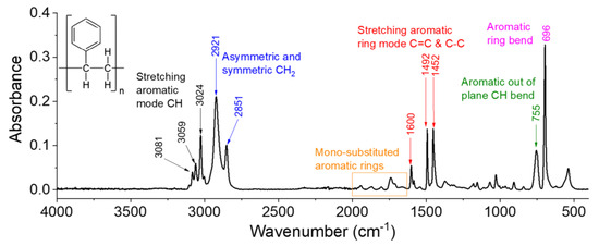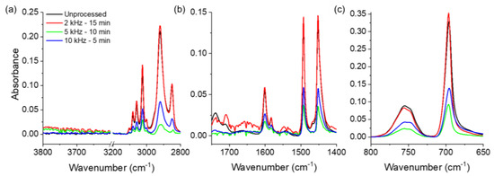 Plasma-induced changes in the composition of the PS were analyzed by recording the FTIR spectra of the samples processed at different frequencies before and after discharge exposure. Figure 7 depicts the spectrum of the unprocessed sample, which is dominated by aromatic ring signals, including the vibrations of aromatic –CH, C=C, and C–C bonds [34]. Herein, the spectrum is decomposed into three regions, and a comparison with the processed samples’ spectra is made for each region.
