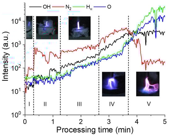 As mentioned earlier (Figure 2), the discharge is initially ignited in streamer mode, and the filaments propagate at the surface of the PS. During this first phase (Phase I; ~20 s), emission signals of different atomic and molecular species are detected (OH, O, H, and N2), and the N2 lines exhibit the highest intensity. The second phase (Phase II; ~20–70 s) also corresponds to the streamer mode, and it is similar to phase I, but with more filaments propagating at the PS surface. In this phase, the intensity of the N2 emission line is almost one order of magnitude higher than that of other emission signals. In phase III (~70–160 s), the discharge remains as streamer, and the first signs of PS degradation are observed (i.e., the modification of the PS surface). During this phase, the number of plasma filaments increases further and so does the water temperature (to almost boiling). Compared to Phases I and II, higher emission intensities are detected in Phase III, and N2 continues to be the dominant species. Phase IV (160–220 s) is similar to Phase III, i.e., there is a further increase in emission line intensities with a significant decrease in PS size, and in Phase V (220–300 s), the plasma touches the water surface and the discharge transitions to spark mode, resulting in a significantly increased evaporation rate and altered gas composition. This is evidenced by the dominancy of the O, H, and OH lines in the Phase V emission spectrum. During this final phase, the PS sample can move freely on the water surface due to its appreciably reduced size, and thus interaction with the plasma is minimized, leading to a lower degradation rate. In summary, the PS sample interacts with a streamer-like discharge at ~3.5–4.0 min and then at ~1.0–1.5 min with a spark-like discharge.