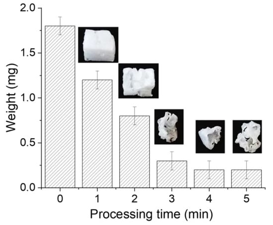Variations in the weights of PS samples processed at V = −12 kV and f = 10 kHz for different times.
