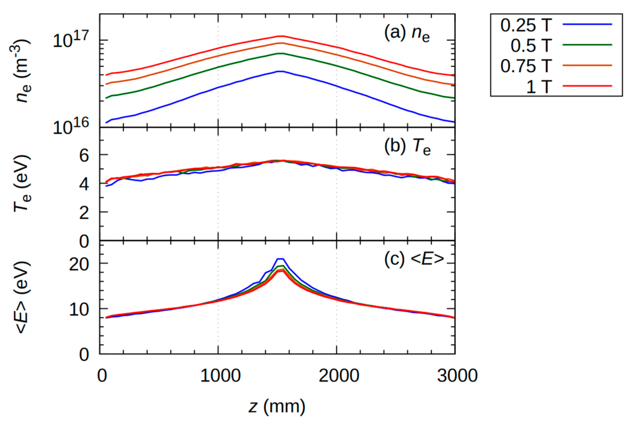 3.2. Effect of the Number of Magnets Nmag on Plasma Axial Distribution