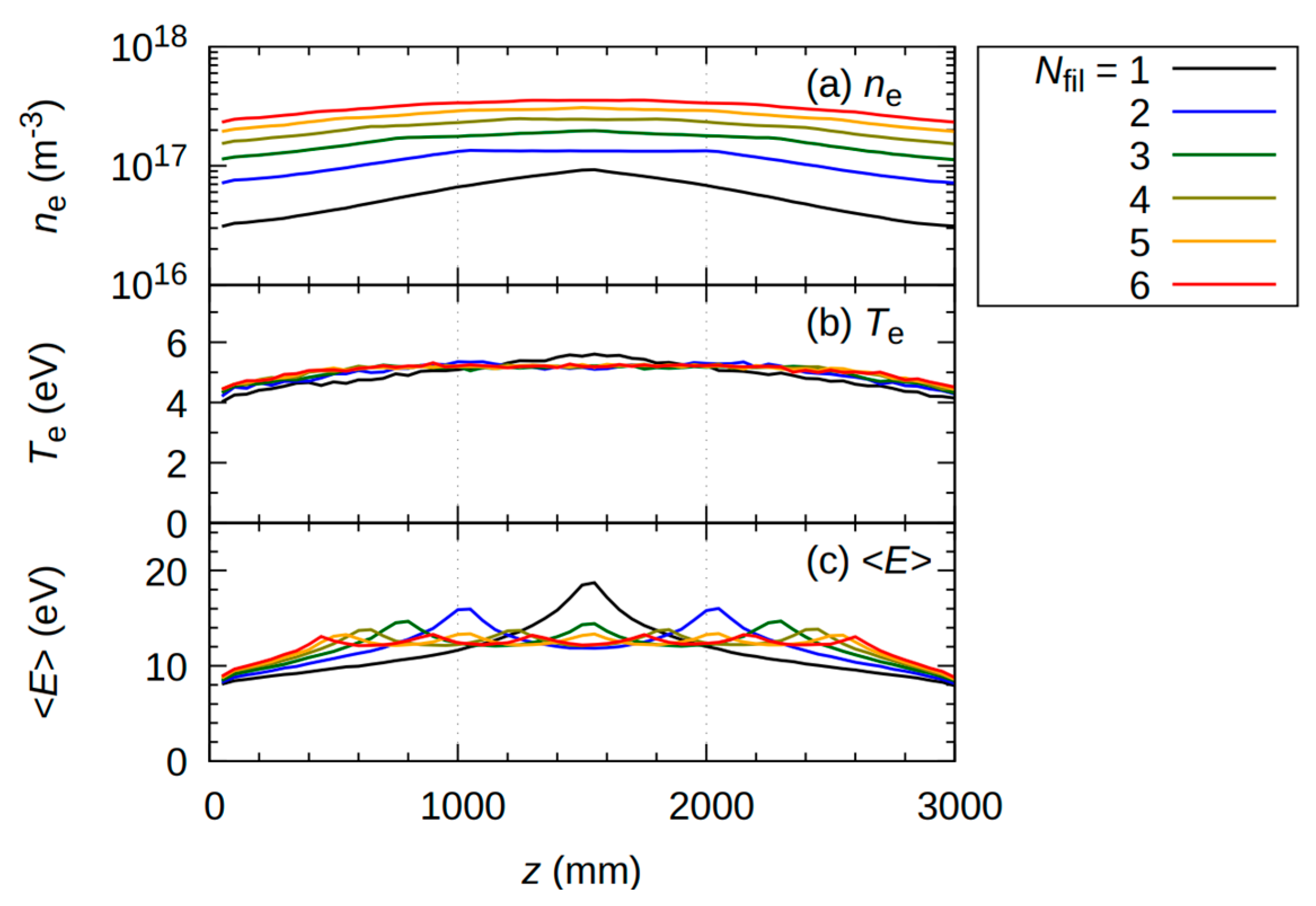 3.3. Effect of Increasing the Number of Filaments on the Axial Plasma Distribution