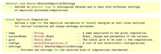 In practice, the data type Empirical.Computation is quite simple to employ. The lower panel of Figure 2 displays its internal definition which, apart from a short name, just comprises information about the nuclear charge (model), a radial grid if needed as well as a list of electron configurations. These configurations describe the shell occupation of the underlying atom or ion, whose electronic structure is later, however, treated by its mean charge distribution and the associated one-electron spectrum. For these configurations, an atomic mean-field representation is first generated in order to obtain the electron binding and kinetic energies for all shells  of the given system. From the binding energies, we can also determine the effective charge that is felt by an electron in the given subshell and which enters, for instance, the generalized BEB model []. The current property of interest in such empirical computations is selected by means of the settings::Basics.AbstractEmpiricalSettings, which enable the user to distinguish between the different branches of these tools; cf. the upper panel of Figure 2 for the definition of this abstract type, which ensures internally the dynamic assignment of the correct code. Of course, each empirical computation also leads to a rather specific outcome that is typically returned in some dictionary (structure), along with a proper printout to screen.