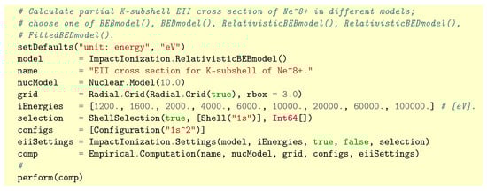 For  ions, in particular, the K-shell EII cross sections have been deduced from the analysis of the charge state distribution evolution of ions that were extracted from an electron-beam ion source for high impact energies  keV []. These ions are relevant because neon has frequently been utilized in tokamaks as a diagnostic element for probing fusion plasmas []. To provide a quick estimate of the K-shell EII cross sections for just helium-like  ions, Figure 4 shows the (Julia) input that needs to be prepared by the user to apply the Jac toolbox. Apart from selecting the units of all (one-electron) energies at in- and output times, this input script specifies a name (string), the nuclear model and a radial grid, as appropriate for a mean-field representation of the given ion, as well as its ground configuration, from which the impact ionization takes place. In the settings, moreover, we call for cross sections for the input energies iEnergies = [1200., 1600., 2000., …] eV. Obviously, moreover, we can only include the ionization from the  shell for helium-like ions, where the partial and total EII cross sections will coincide in this case. All the cross sections are eventually printed to screen once the computations have been perform ed. Let us mention, finally, that all these calls in Figure 4 can also be made line-wise in order to immediately see and check the consistency of the given specifications.
