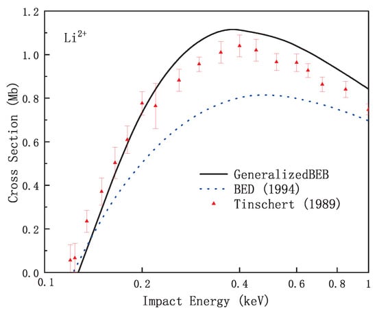 Predictions of the K-shell EII cross sections have been found sensitive, especially for low-Z atoms and ions. By using a similar input as in Figure 4, we have also estimated the  ionization of hydrogen-like  ions at low impact energies  keV. Figure 6 displays and compares the partial cross sections from the generalized BEB model with the original BEB estimates of Kim and Rudd [] and the measurements by Tinschert et al. []. For these low-Z ions, the use of an effective charge in the generalized BEB is crucial and brings the estimated cross sections in close agreement with the experiment. Whereas such computations are obviously selective and cannot ensure the same accuracy for the EII cross sections of all other atoms and ions, a comparable good agreement has been found in a number of further test calculations.