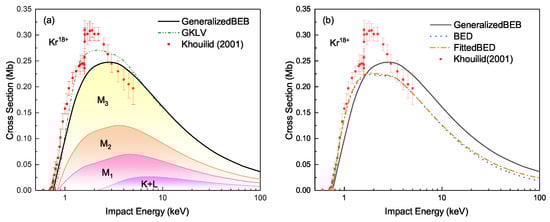 K-, L- and M-shell partial EII cross sections of the  ions for impact energies  keV. (a) The partial cross sections from the generalized BEB model are shown in color for the individual (sub)shells, while the total EII cross section (black solid line) from the present work is compared with the estimates of Haque and coworkers ([], green dashed line) and the measurements by Khouilid et al. ([], red circles). The jumps in the measured EII cross sections (red circles) at  keV arise from the onset of  electron-impact excitations with subsequent autoionization. (b) Comparison of the  partial EII cross section from four empirical models implemented in Jac: generalized BEBmodel (black solid line), BEDmodel (green dashed line) and FittedBEBmodel (red dashed-dotted line); cf. Table 1 for a brief account of these empirical models.
