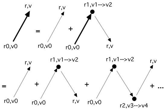 In the figure, once again using a notation borrowed from quantum field theory [61], an arrow represents a Green function, a dot represents the effect of integration and of the positive part of the collision operator J, a thick arrow represents the exact Green function G (i.e., the Green function of the full transport equation). Here, g, the thin arrow, represents not just collisionless particle propagation, but includes exponential decay. This is essential for the full G, the thick arrow, to conserve the normalization of f. If the null-collision method is used, the operator represented by the dot contains a term not affecting f and a term with , .